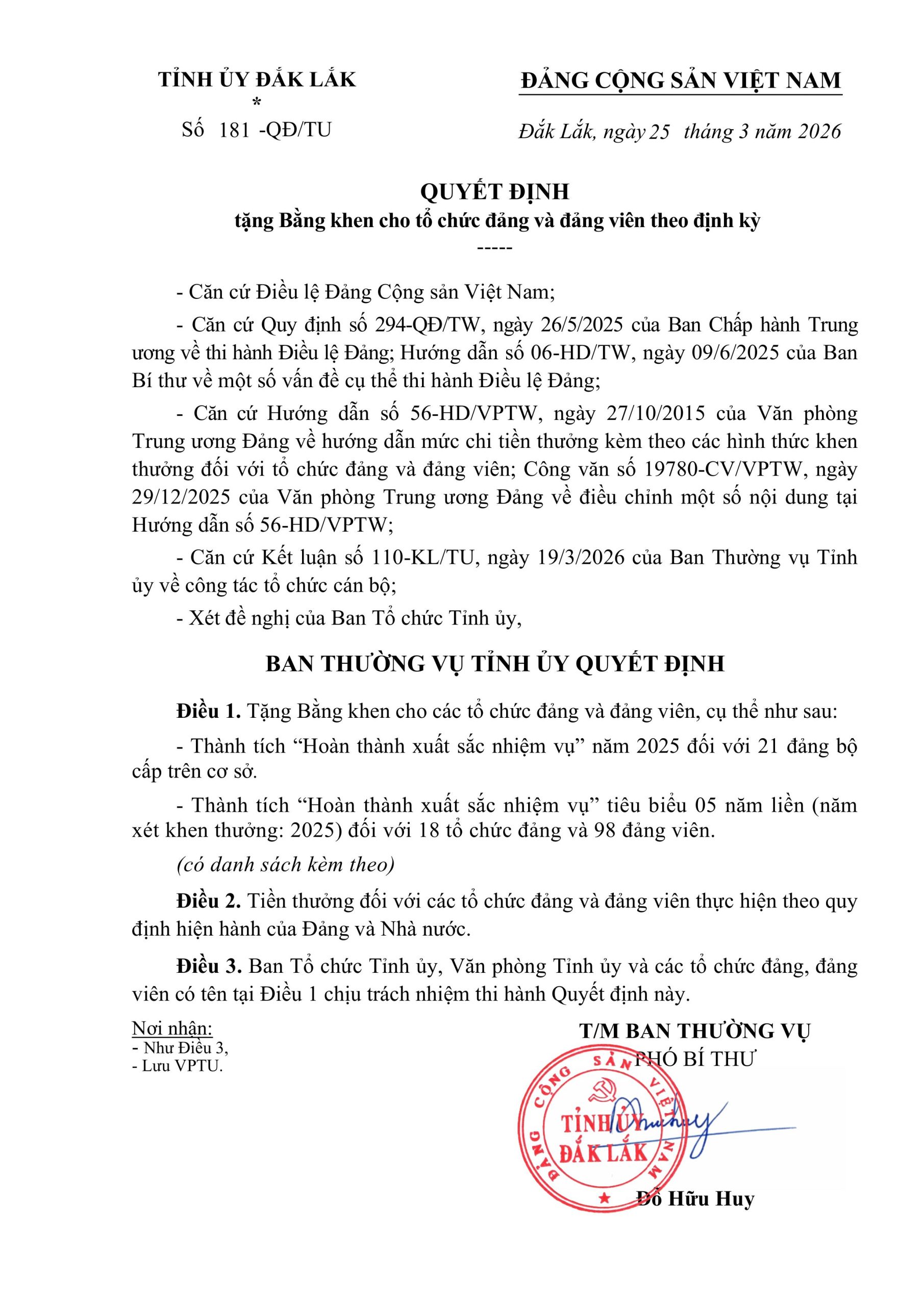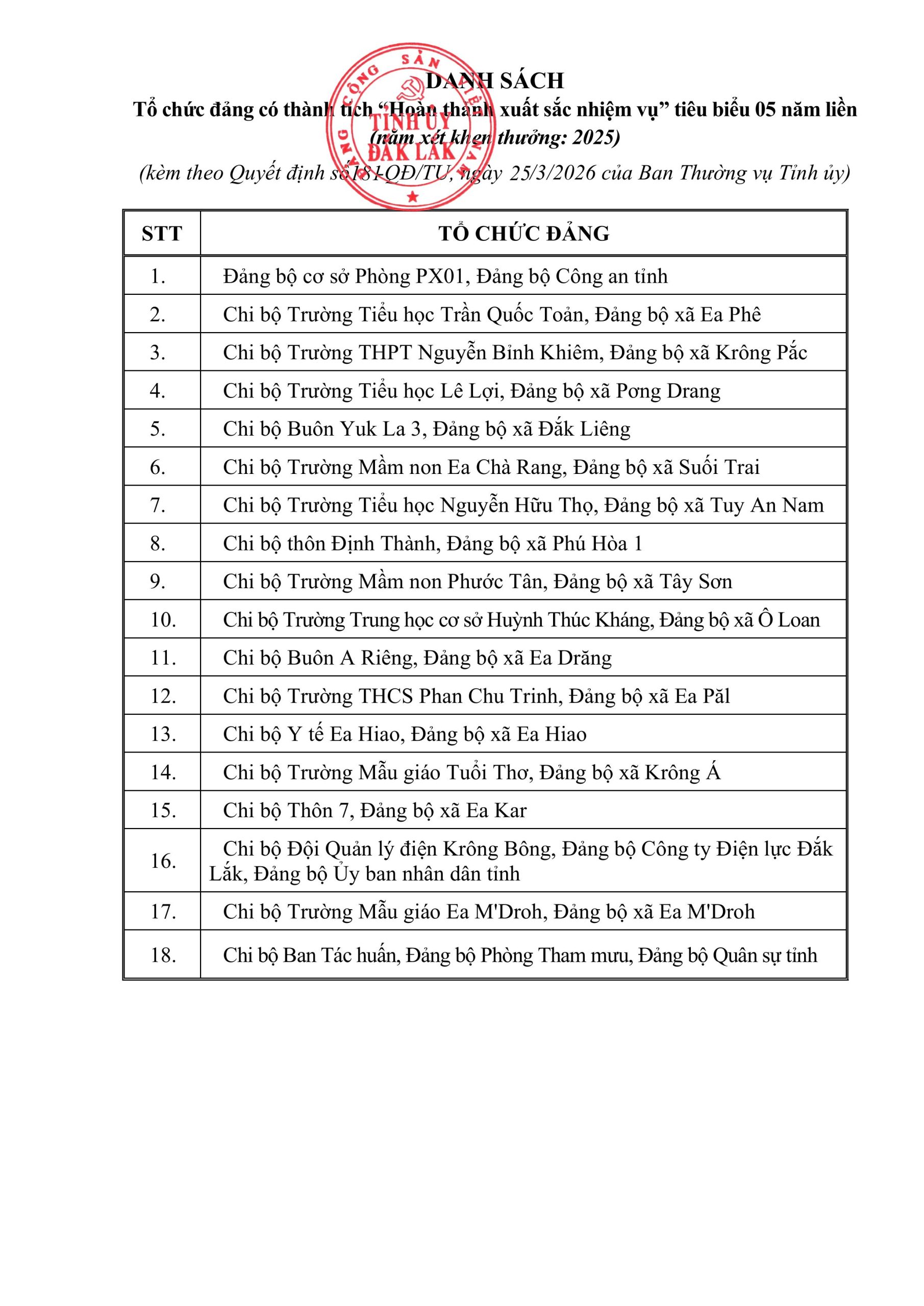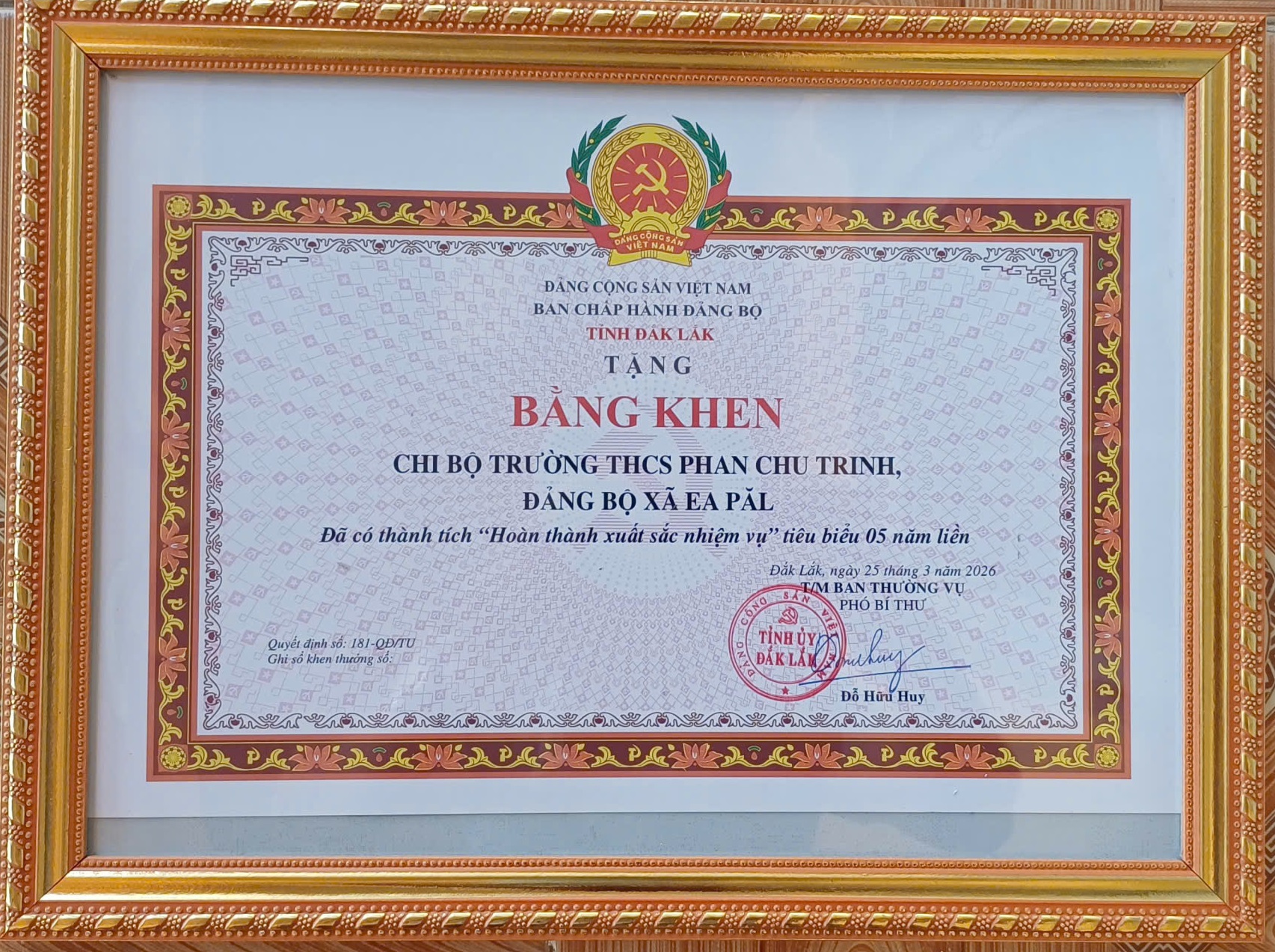 CHI BỘ TRƯỜNG THCS PHAN CHU TRINH ĐƯỢC BAN THƯỜNG VỤ TỈNH ỦY ĐẮK LẮK TẶNG BẰNG KHEN CÓ THÀNH TÍCH XUẤT SẮC TRONG 5 NĂM LIÊN TỤC.