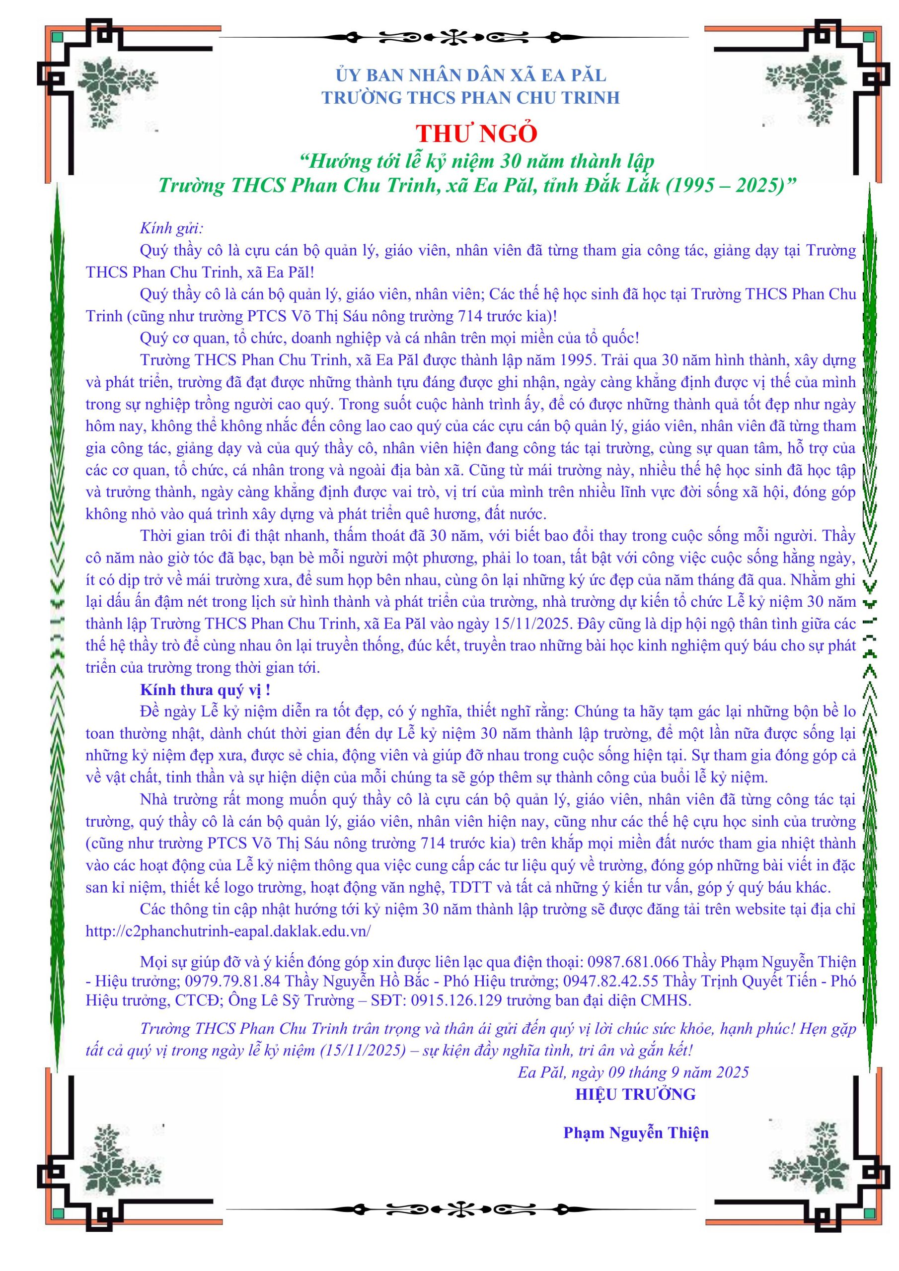 Thư ngỏ hướng tới kỉ niệm 30 năm thành lập trường THCS Phan Chu Trinh, xã Ea Păl, tỉnh Đắk Lắk (1995 – 2025)